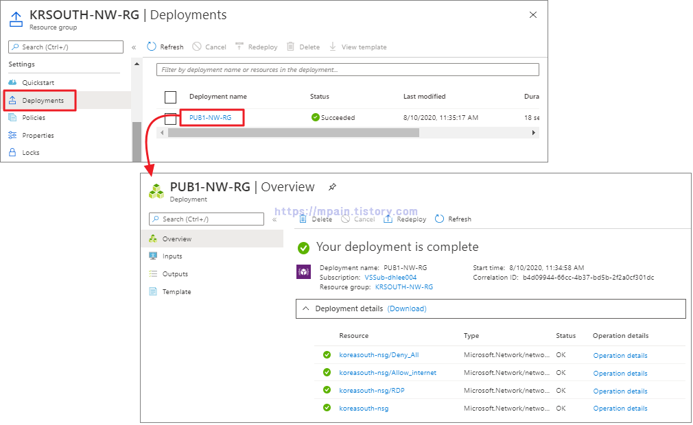 json 템플릿을 이용한 배포이기 때문에, Resource Group의 Deployments 메뉴에서 배포 상태를 확인할 수 있습니다.