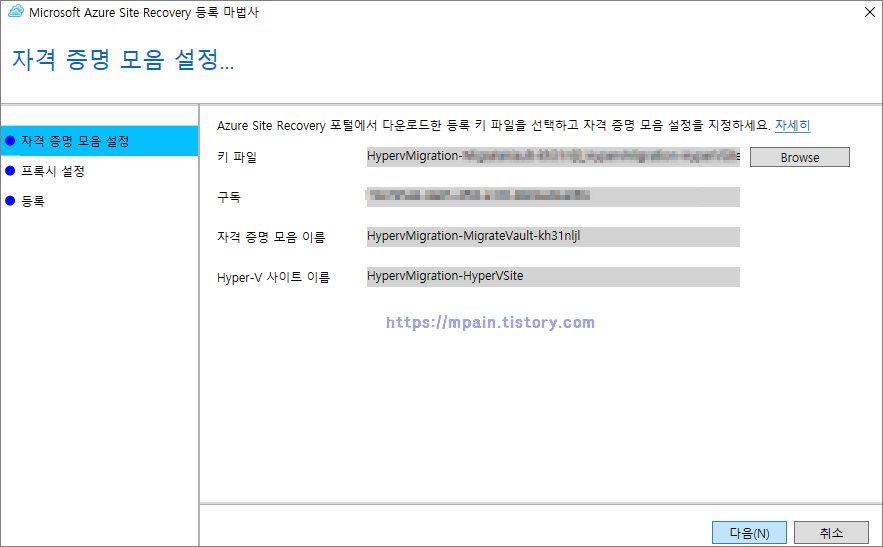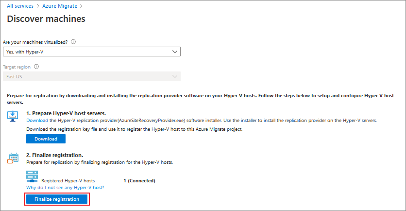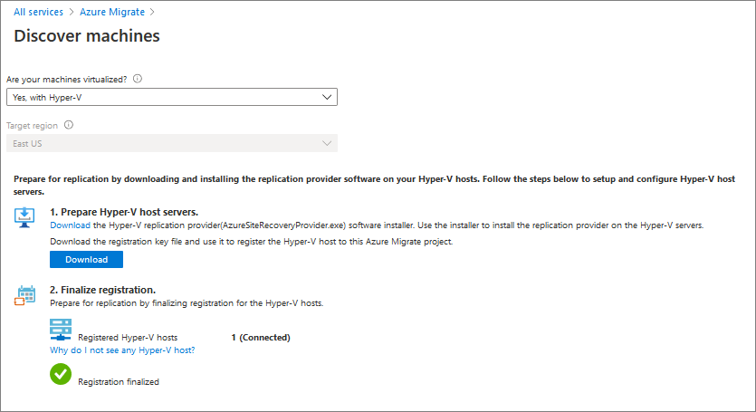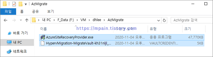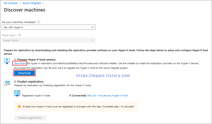 - registration key는 Hyper-V 호스트를 Azure Migrate Server Migration에 등록하기 위해 필요합니다.