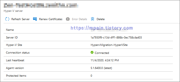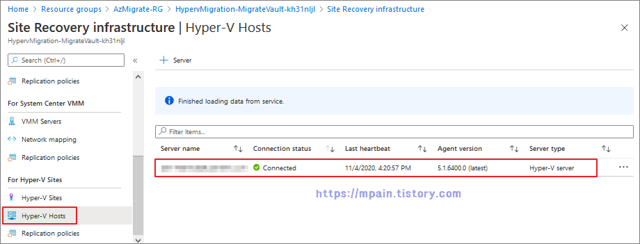 Azure Site Recovery vault - Manage - Site Recovery Infrastructure - For Hyper-V Sites - Hyper-V Hosts에 Hyper-V 호스트가 표시됩니다.