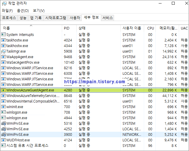 VM Agent 설치가 완료되면, 작업 관리자에서 WindowsAzureGuestAgent.exe 프로세스가 표시되는 것을 확인할 수 있습니다.