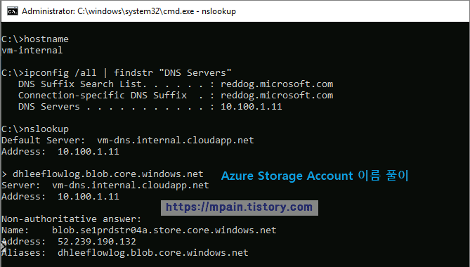 테스트에서는 Azure Storage account에 대한 이름 풀이를 시도해 보았습니다. 이름 풀이에 문제가 없음을 확인할 수 있습니다.