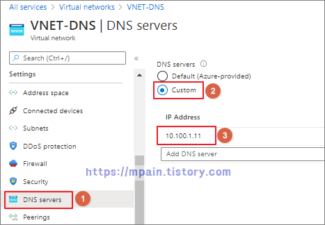 Virtual network - DNS servers - Custom 선택 - DNS VM(Vm-dns)의 IP 주소 입력