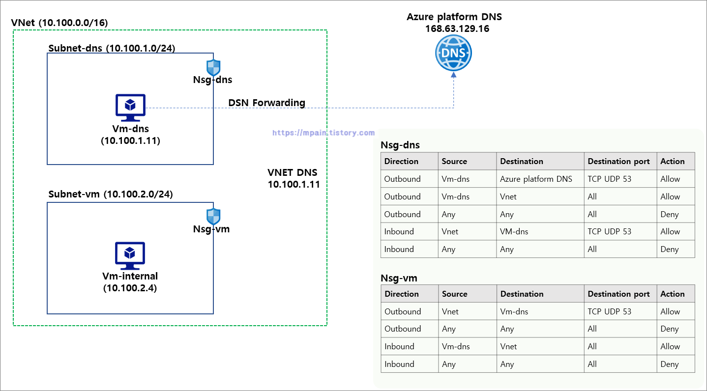 --- Outbound : Vm-dns에서 Azure Platform DNS(168.63.129.16)로 나가는 TCP/UDP 53 허용 (Priority 100). Vm-dns에서 Virtual Network로 나가는 모든 트래픽 허용(Priority 110). 그 외 모두 차단 (Priority 4000)