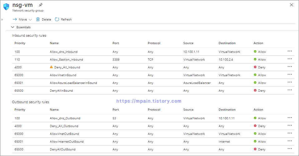 --- Inbound : Vm-dns로 부터 들어오는 모든 트래픽 허용(Priority 100). 그 외 모두 차단(Priority 4000)