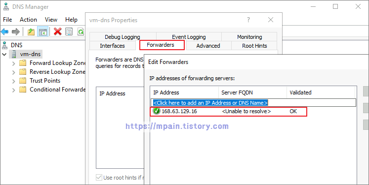 3. Vm-dns에 Windows DNS 역할 설치 및 전달자(forwarder) 설정