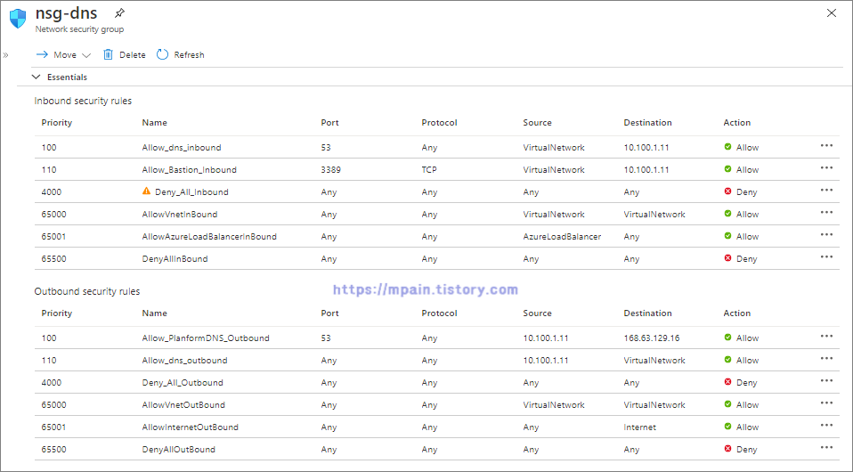 --- Inbound : Virtual Network로 부터의 Vm-dns로 들어오는 TCP/UDP 53만 허용(Priority 100). 그 외 모두 차단(Priority 4000)