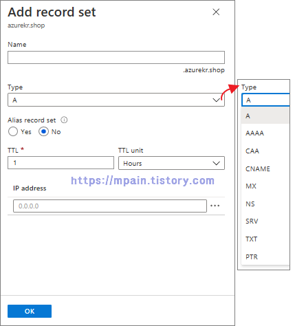 Azure DNS Zone에서 +Record set을 선택하고 DNS 레코드를 등록합니다.
