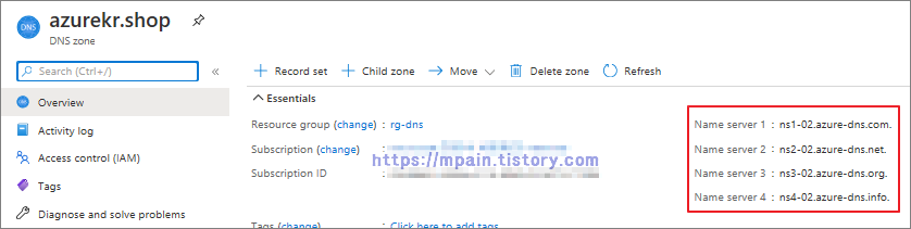 DNS Zone 생성이 완료되면 Name server 정보를 확인할 수 있습니다. 이 Name server 정보들을 가비아 도메인 관리에서 네임 서버로 등록해 주어야 합니다.