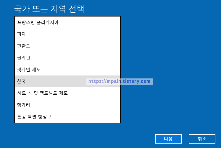 국가 또는 지역 선택 - 한국 선택 후 [다음]