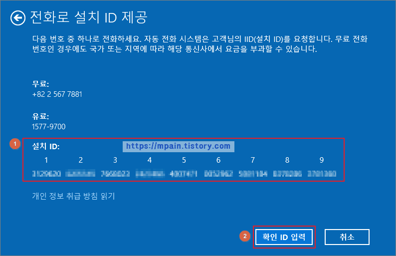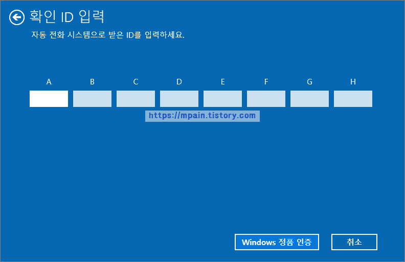 자동 응답에서 불러주는 확인 ID를 입력 후 [Windows 정품 인증] 클릭하면 정품 인증이 완료됩니다.