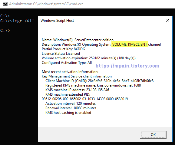 참고) Azure Window VM의 현재 정품 인증 방식 확인
