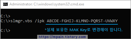 매우 강한 보안 요구 사항과 같은 특별한 이유로 KMS 서버와 통신을 허용할 수 없는 네트워크 환경에서는 어떻게 해야 할까요? 그냥 정품 인증 메시지가 떠도 무시하고 사용하던가, 아니면 정품 인증 방식을 MAK(Multiple Activation Key)로 바꿔주면 됩니다.