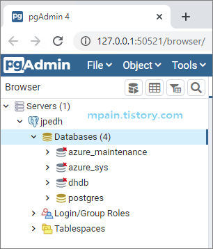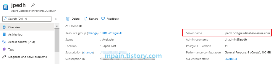 기본적으로 Azure Database for PostgreSQL은 서버의 FQDN(예. jpedh.postgres.database.azure.com)으로 접속해야 합니다. 즉 인터넷으로 접속해야 합니다.
