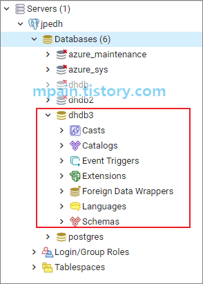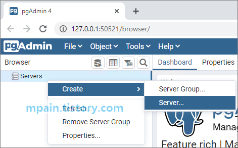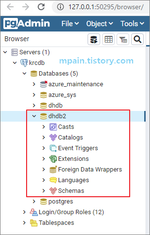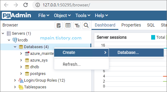 Primary DB (krcdh)에서 pgAdmin Tool을 실행합니다. Databases를 오른쪽 클릭 후 Create - Database를 클릭합니다.