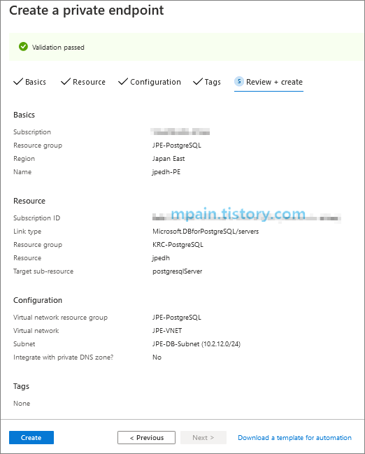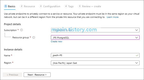 - Name : Private Endpoint 이름 (예. jpedh-PE)
