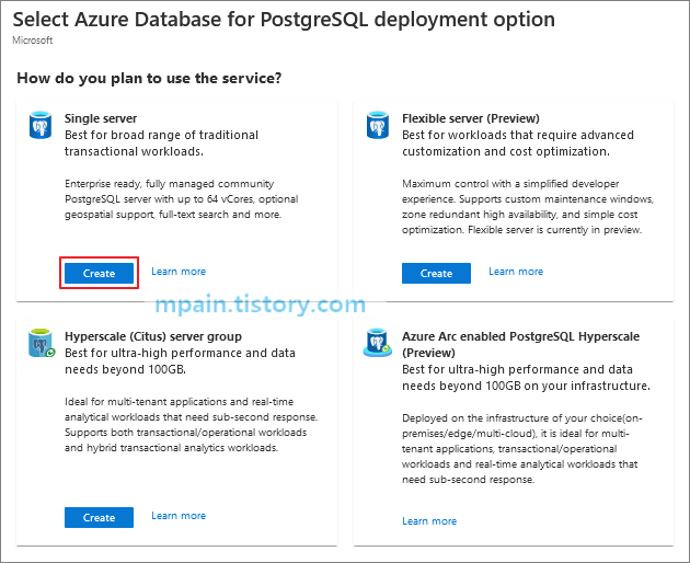 Azure Database for PostgreSQL을 배포하는 절차는 아래와 같습니다.