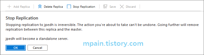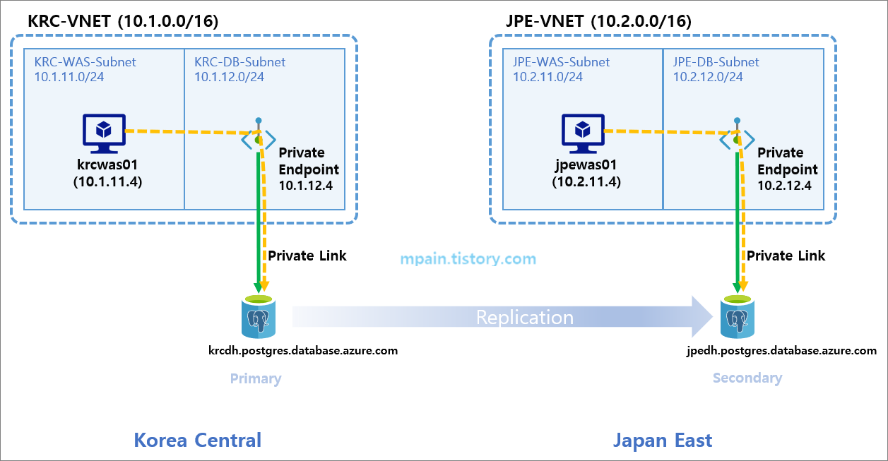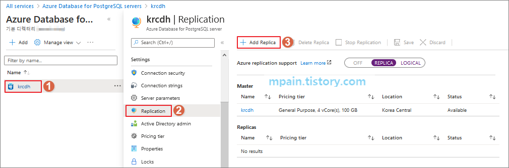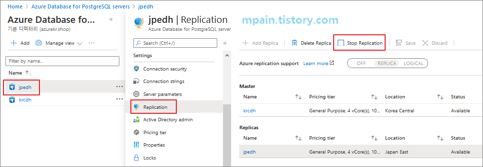 Korea Central의 Primary DB를 Japan East로 복제합니다. 복제 구성 절차는 아래와 같습니다.