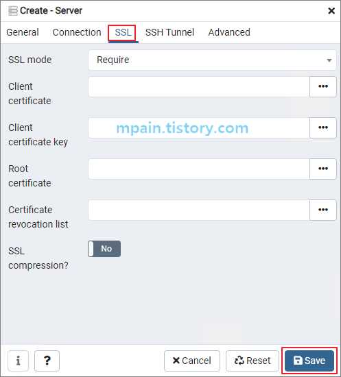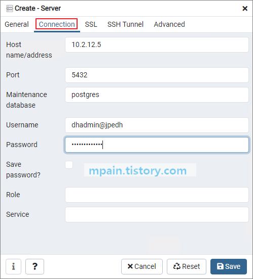 - Username / Password : PostgreSQL 생성할 때 사용한 계정 정보 입력