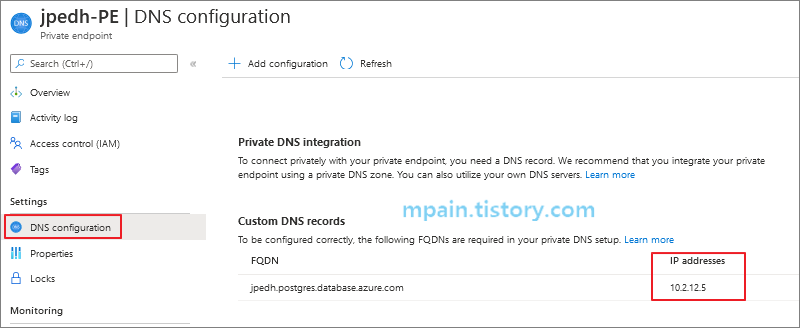 배포된 Private Endpoint의 DNS Configuration에서 Private IP 주소를 확인할 수 있습니다.