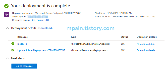 복제를 테스트하기 위한 준비는 끝났습니다만, 이정도만 테스트하기엔 아쉬우니, Azure Database for PostgreSQL용 Private Endpoint를 배포하고 Private IP 주소로 연결하도록 구성해 보겠습니다.