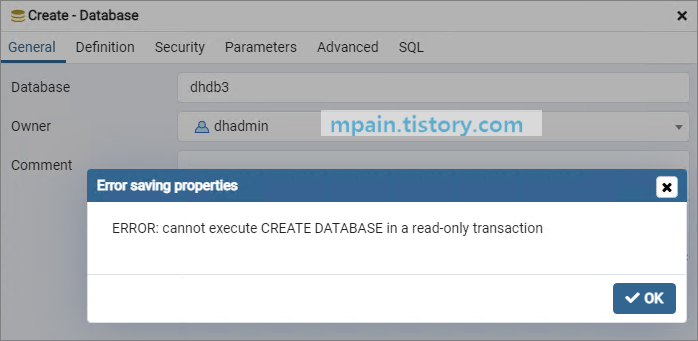 복제본 DB는 Read only 이기 때문에, 쓰기 작업 (예. DB 생성)을 시도하면 아래와 같이 실패합니다.