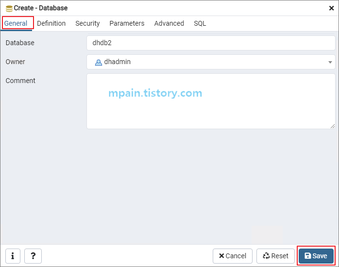 General 탭의 Database 입력란에 새로 생성할 Database 이름(예. dhdb2)을 입력하고 [Save] 를 클릭합니다.