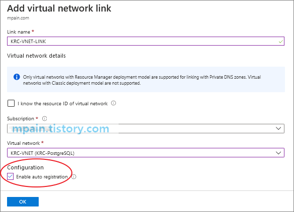 Azure 가상 네트워크(KRC-VNET)를 Azure Private DNS(mpain.com)에 Auto-registration이 활성화된 Link로 연결하였습니다.