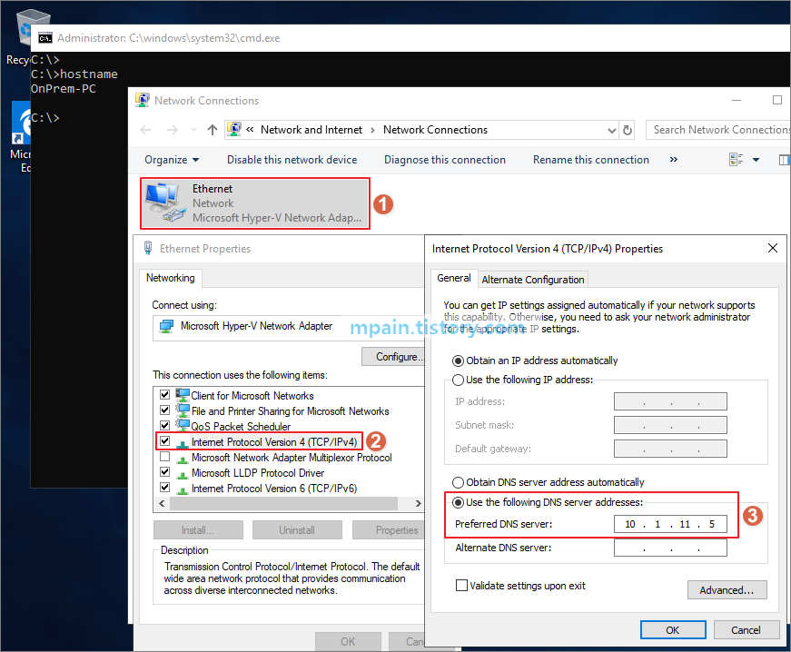 온프레미스 PC에서 Azure DNS VM의 IP 주소를 DNS로 사용합니다.