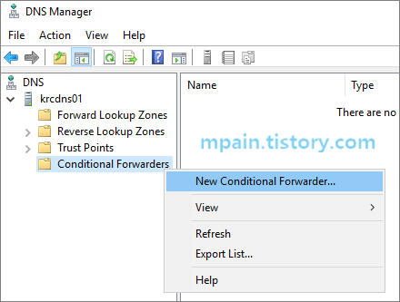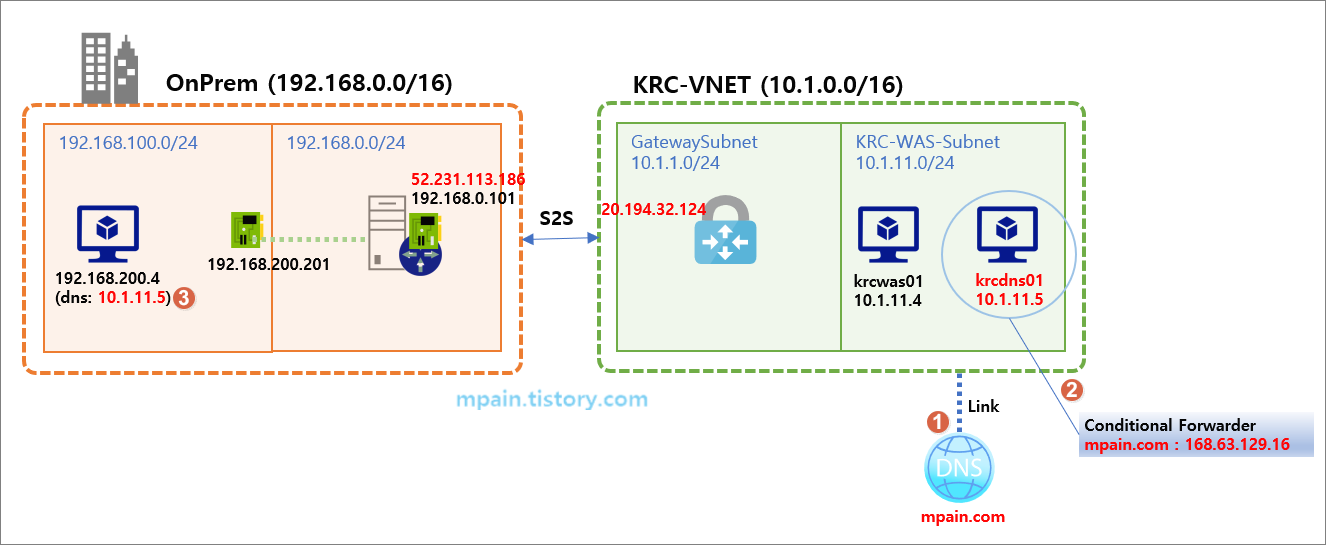 - Azure에 Windows Server VM(krcdns01)에 DNS 역할을 설치한 후, Azure Private DNS로 조건부 전달자(Conditional forwarder)를 구성합니다.