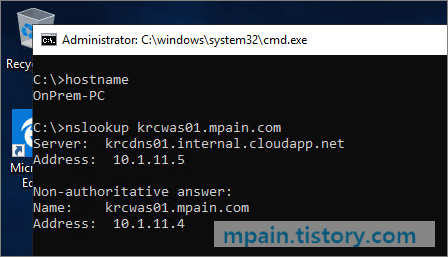 온프레미스 컴퓨터에서 nslookup으로 Azure Private DNS 이름으로 이름 풀이가 되는지 확인해봅니다.
