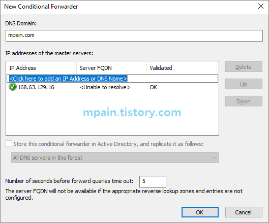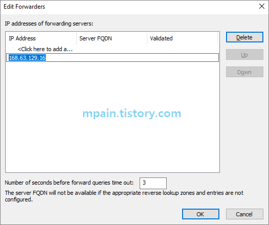 Azure 플랫폼 DNS(168.63.129.16)를 Azure Private DNS 이름(mpain.com)에 대한 조건부 전달자(Conditional Forwarder)로 설정합니다.