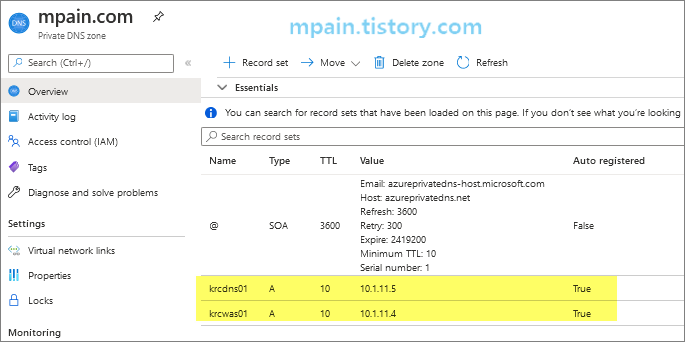 테스트에서는 Korea central에 mpain.com 이라는 이름의 Private DNS를 만들었습니다.