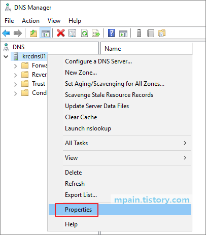 DNS 오른쪽 버튼 클릭 - Properties