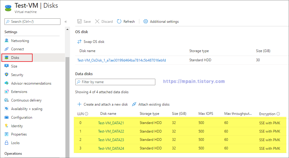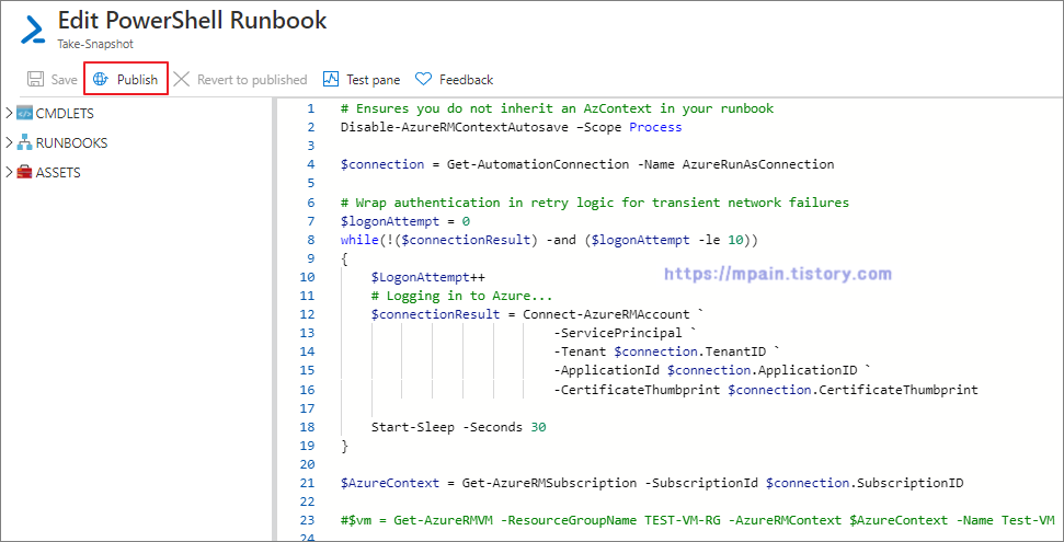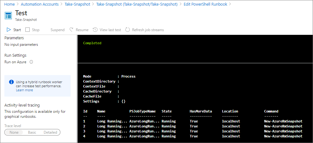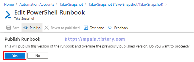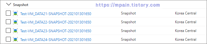 Azure Automation을 사용하여 Test-VM의 4개의 Data Disk의 Snapshot을 새벽 1시 50분에 생성합니다.