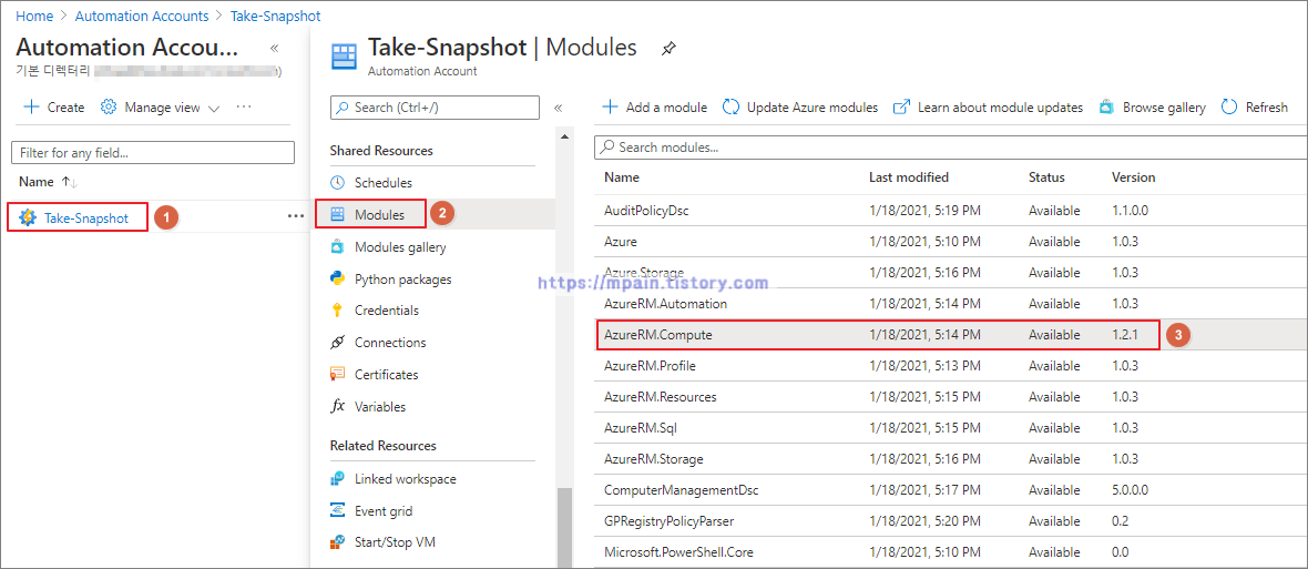 Disk Snapshot을 생성하는 스크립트를 Automation Account에서 사용하여 위해서는 필요한 PowerShell 모듈을 가져오기 해야 합니다..