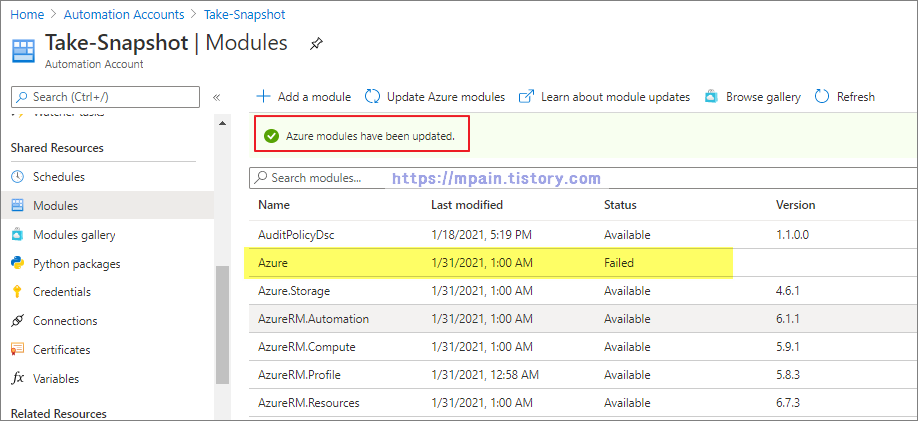 *Azure 모듈이 Failed로 표시될 수도 있습니다. Azure 모듈이 Failed로 표시되는 이유는 알 수 없지만, Snapshot을 생성 작업에는 영향이 없습니다.