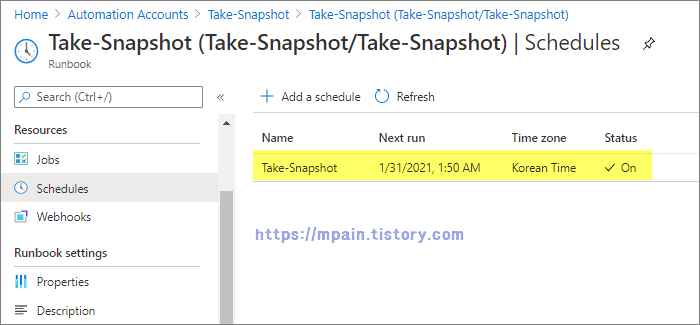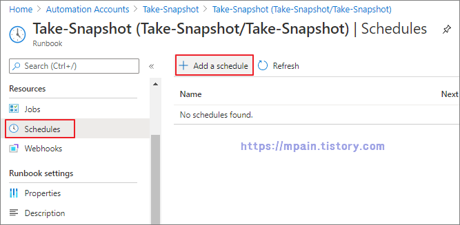 대상 Runbook - Schedules - +Add a schedule