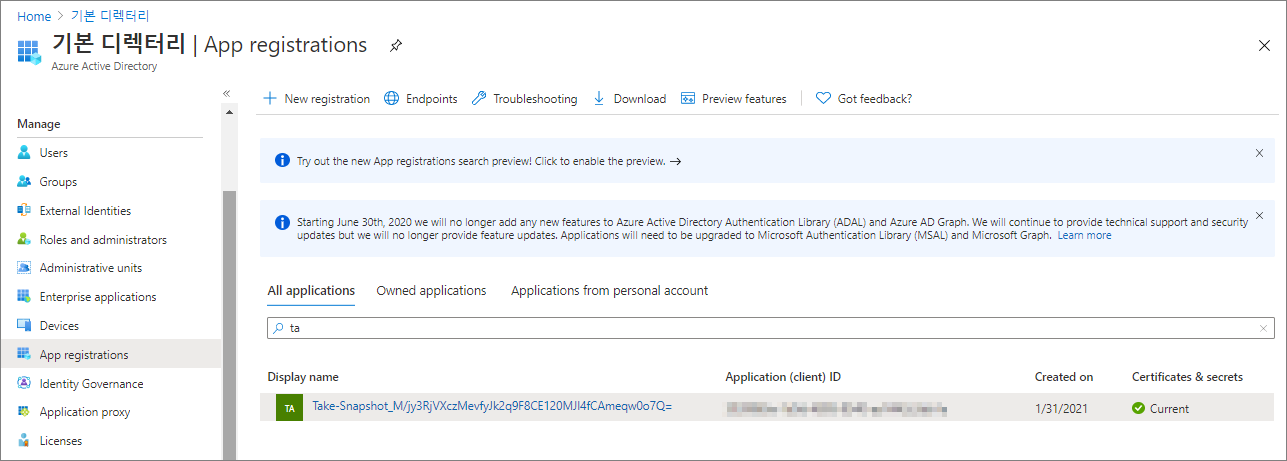 | *참고 - Run As account Create Azure Run As account를 Yes로 설정하면, Azure Active Directory에 App Registration (Service principal)이 생성되고, 구독에 대한 Contributor로 자동으로 등록된다. ![]() ![]() |