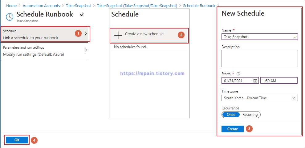 Schedule - Create a new schedule - Script 실행 시간 설정 - [Create] - [OK]