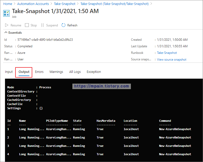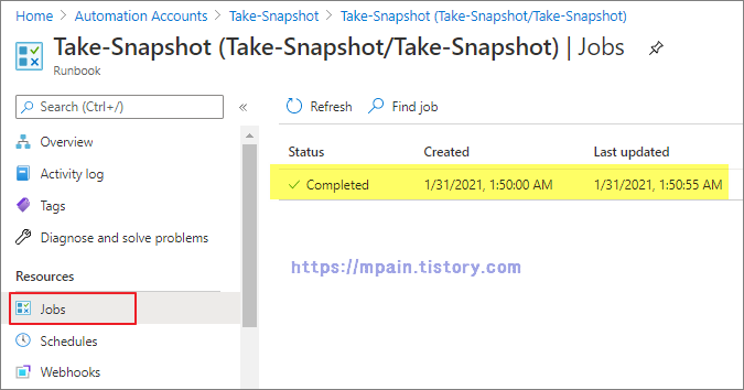 Runbook의 jobs에서 Script 실행 결과를 확인할 수 있습니다.