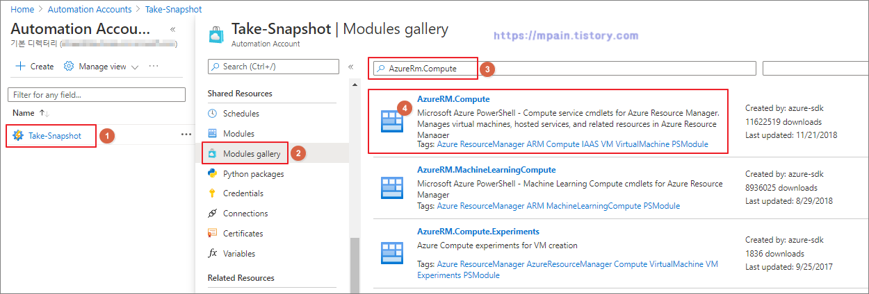 Automation Account - Module gallery 에서 "AzureRm.Compute" 검색하고 AzureRm.Compute 모듈을 선택합니다.