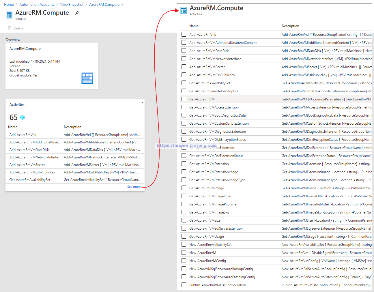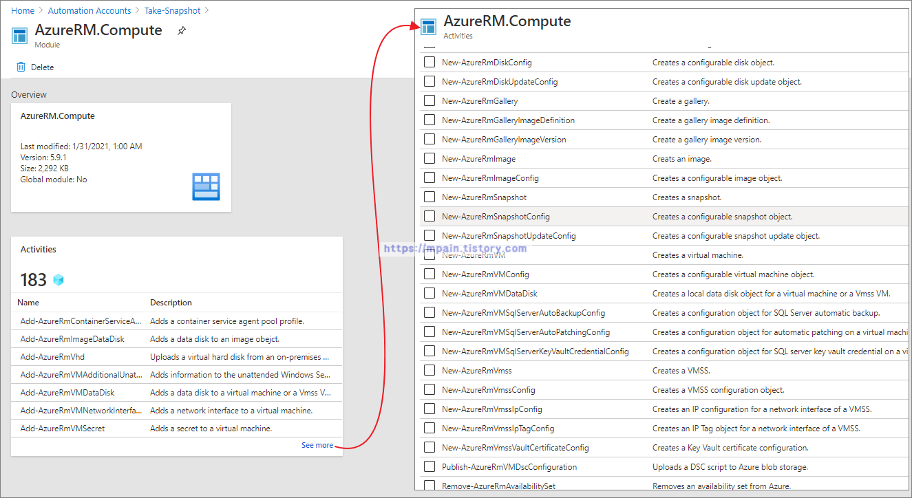 Automation Account의 AzureRm.Compute 모듈을 확인해보면 Snapshot에 필요한 명령이 보이지 않습니다.