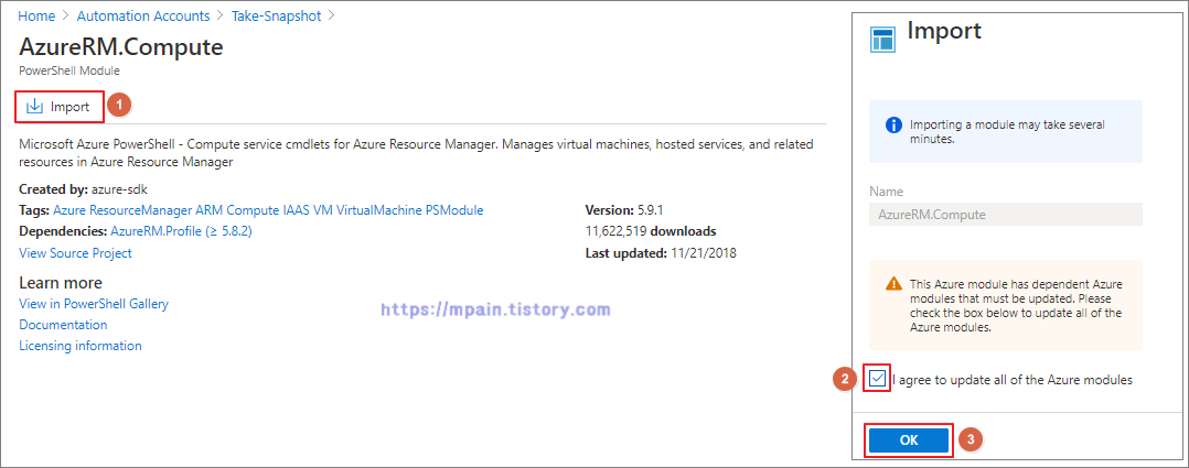 Import를 클릭하고 I agree to update all of the Azure modules에 체크하고 [OK] 버튼을 클릭합니다.