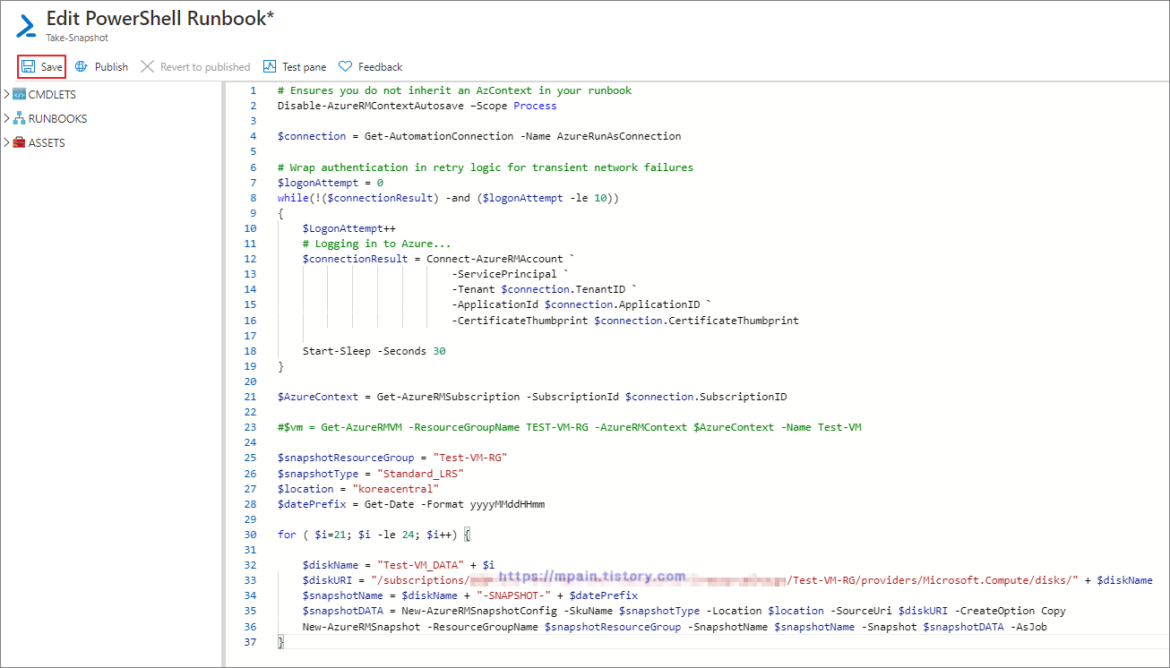 PowerShell Script를 붙여 넣고 Save 합니다. (변수들은 상황에 맞게 수정해야 합니다.)