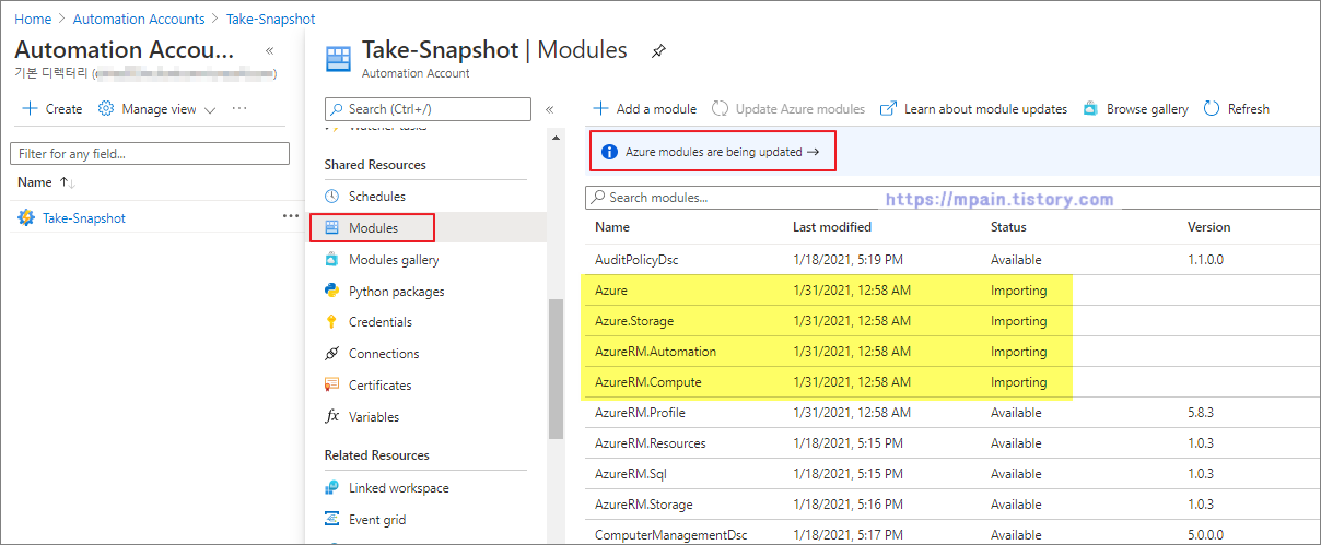 Modules 를 클릭해보면 "Azure modules are being updated" 라고 표시되는 것을 확인할 수 있으며, 관련된 모듈들이 Import 되고 있는 중인 것을 확인 할 수 있습니다.