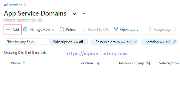 Azure 포털의 검색란에 app service domain을 찾아서 선택합니다.