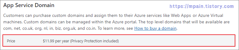 Azure App Service Domain의 가격 정보는 아래에서 확인하실 수 있습니다.