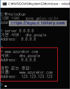 nslookup 명령으로 www에 대한 IP 주소를 확인해보면, Azure DNS Zone에 등록한 Host A 레코드 정보가 반환되는 것을 확인할 수 있습니다.