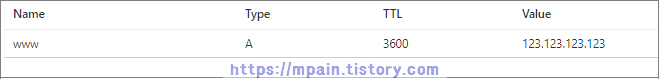 테스트로 Azure DNS Zone에 www라는 Host A 레코드를 아래와 같이 추가했습니다.
