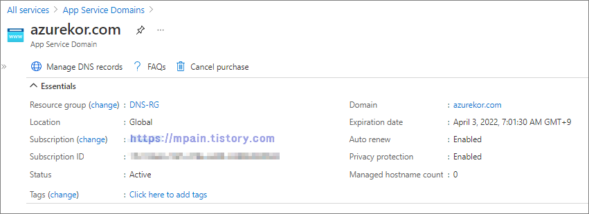 구매한 도메인 이름과 동일한 이름의 DNS Zone이 생성된 것을 확인할 수 있습니다.